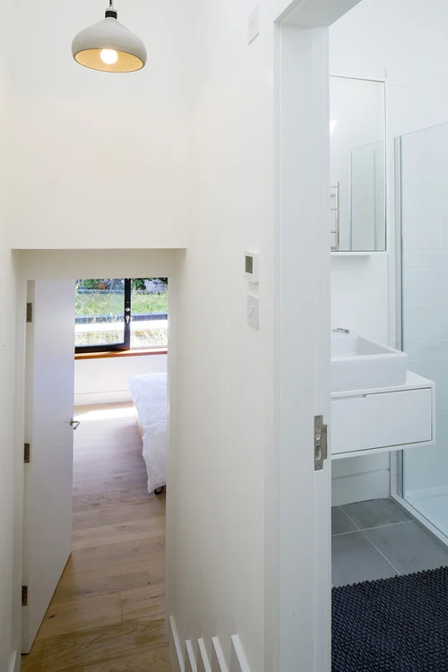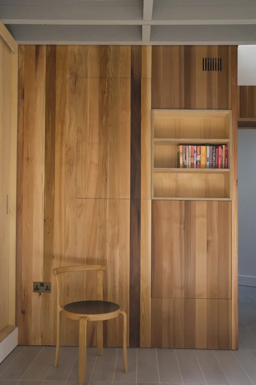 The house has been deliberately and robustly crafted; the walls are handmade brick, doors and windows are bespoke cedar with cedar cladding internally and externally. Internal joinery helps to maximise the usable space. Exposed sawn timber joists over main areas are painted grey and the ceilings to circulation and service areas are smooth and white. Main light fittings are vintage Danish but the building is naturally lit via a series of large roof lights. The roof is a bio-diverse green roof planted with wild flowers.