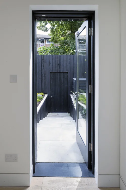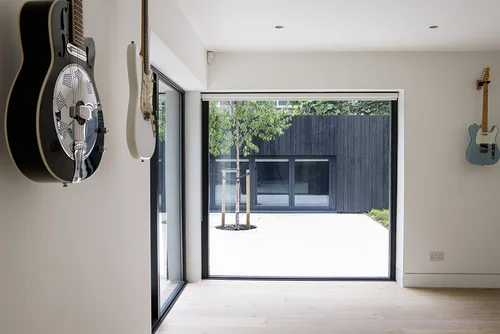 The construction of the studio at the end of the garden provided the opportunity to create a courtyard, partially screened from overlooking. Green roofs provide visual interest and add to the local biodiversity. To reinforce the enclosure and coherence of the outdoor space the perimeter of the courtyard has been clad in black stained timber with a paved surface, perimeter planting and two new trees. The new bedroom overlooks the courtyard across a planted roof from the first floor. The ground floor has been opened up to bring views and light into the kitchen and dining room in the middle of the house.